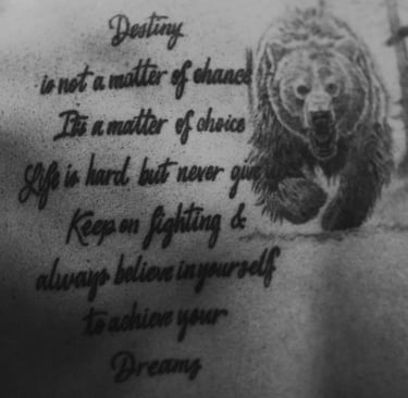 El texto del tatuaje dice: "Destino no es un problema de oportunidad, es un asunto de elección. La vida es dura, pero nunca te rindas, sigue brillando y cree en ti mismo para alcanzar tus sueños." Una frase cargada de motivación que refleja la mentalidad de Canelo, forjada a base de disciplina, sacrificio y confianza en sí mismo desde sus inicios en el boxeo profesional.